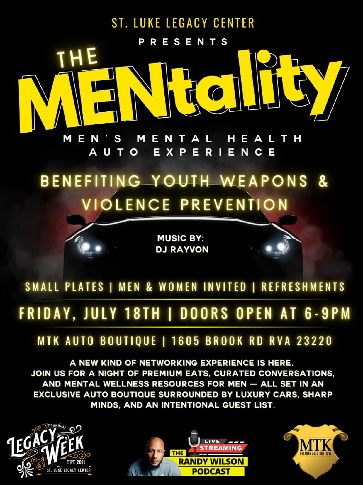 During our Legacy Week of 2025, join us at MTK Auto Boutique in Richmond, VA for our first-ever Black Men’s Mental Health Benefit Event. It’s not your typical happy hour, it’s a celebration of strength, restoration, and community.
